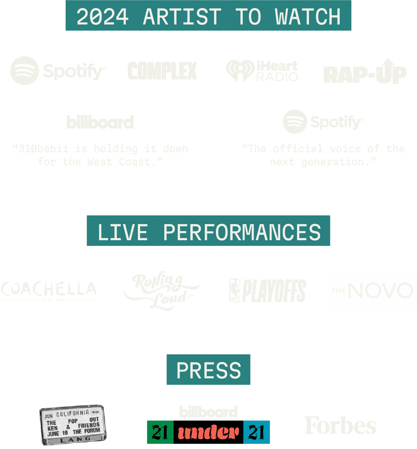With several songs that have each generated tens of millions on streams, including "rock your hips" which landed him his second #1 on Billboard's Rhythmic Chart. He continues to cement himself as part of the latest generation of culture moving hip hop artists. In addition to his streaming success, 310 has appeared onstage at Coachella, performed sets at Rolling Loud on both sides of the Atlantic, and sold out a hometown Los Angeles show at The Novo.