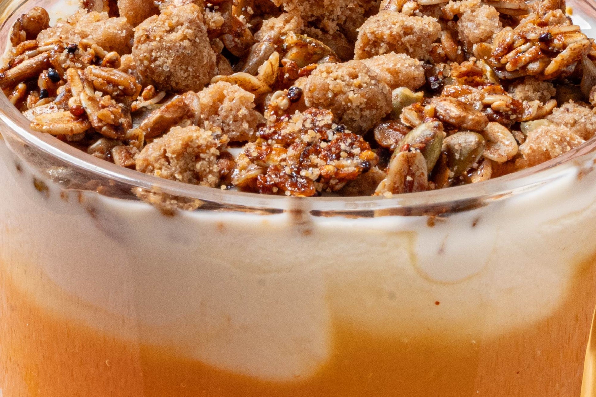 Layers of peach compote, creamy maple yogurt, and a crunchy granola crumble with a hint of cinnamon.