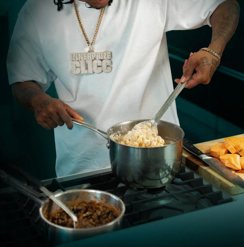 “I grew up on a lot of Hispanic food — tacos, asada, all of that. But I also grew up on soul food — mac and cheese, greens, the works. So for me, it’s always been this natural blend of both cultures. That’s just how we live out here in South LA. Everybody’s mixing it up. I wanted to create something that reflects where I come from — something the people I grew up with could relate to and enjoy. I used to throw leftovers together — some tacos, some mac and cheese — and that combo just stuck with me. So this meal isn’t just about flavor, it’s about blending cultures, and creating something new that still feels familiar.”