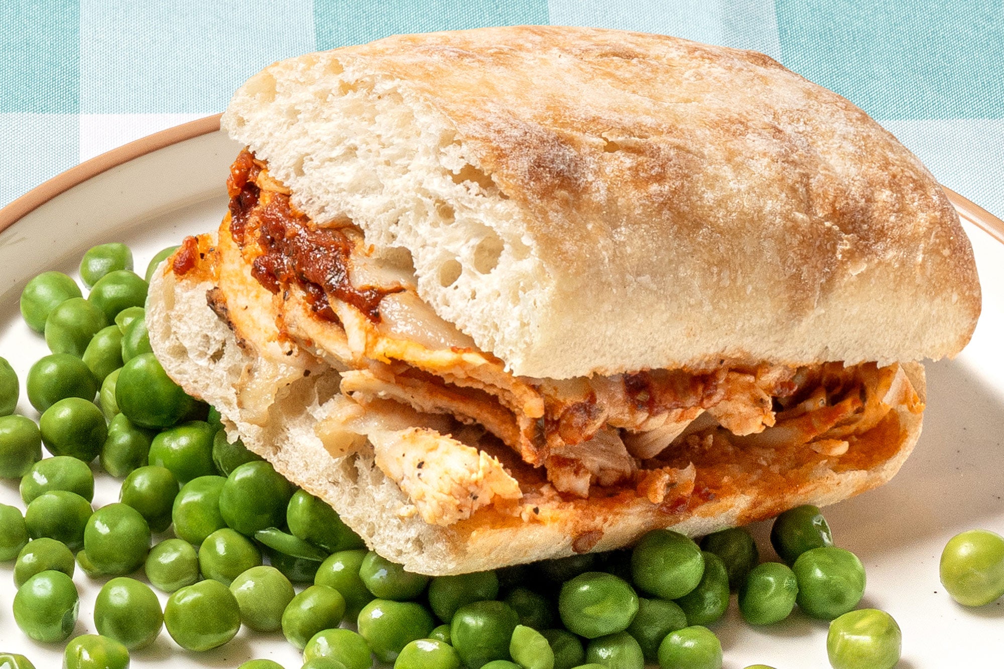 Order nowSliced roasted chicken topped with marinara sauce and melted mozzarella on a warm ciabatta served with a side of green peas.