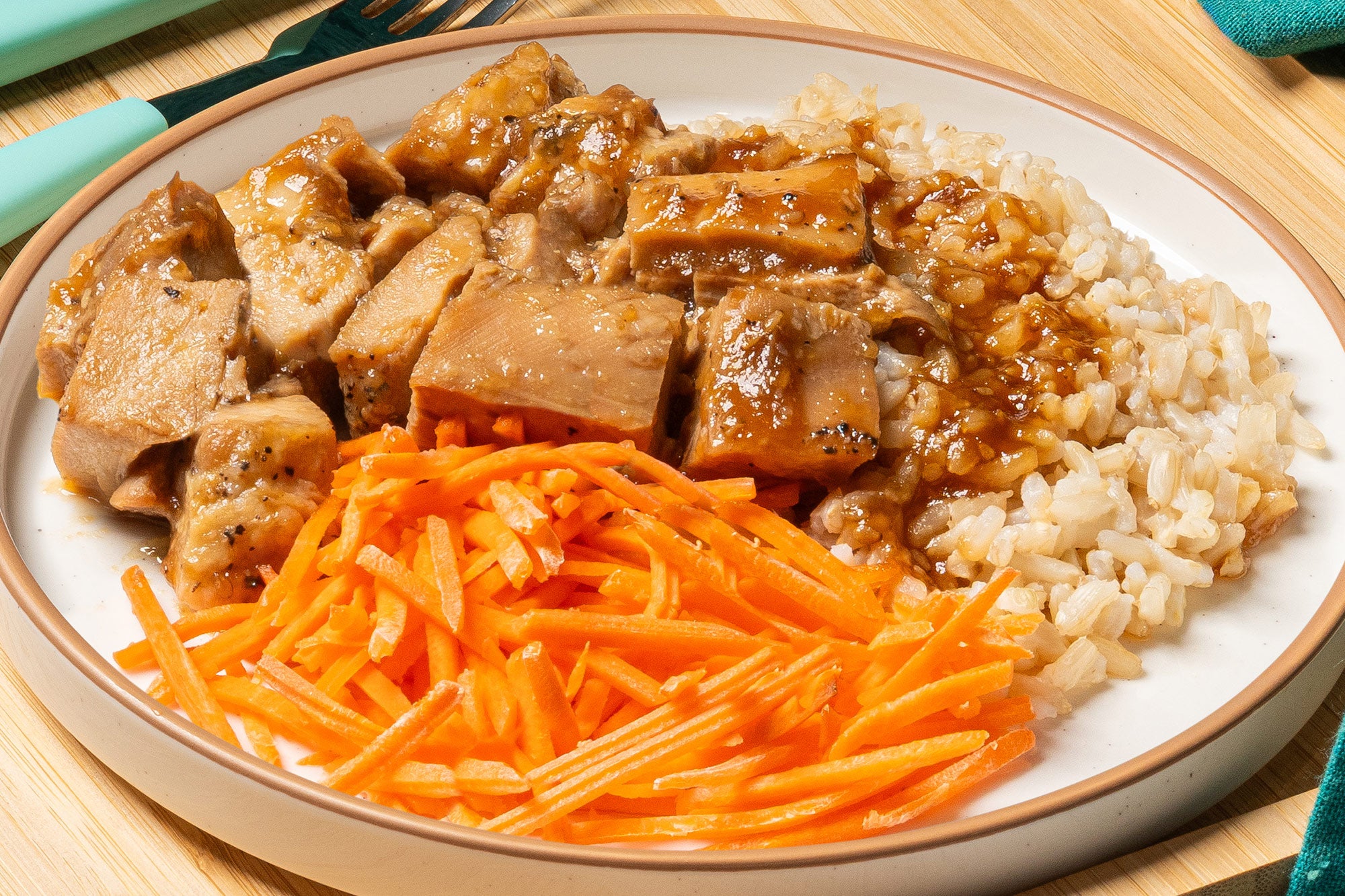 Order NowTender roasted chicken glazed in sweet and savory teriyaki sauce, served over hearty brown rice with a side of thinly sliced carrots.