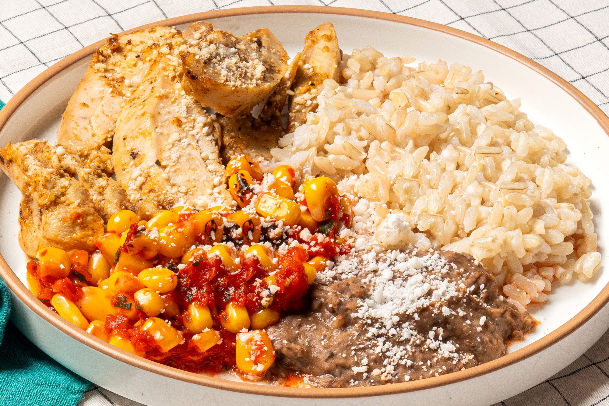Order nowTender achiote-roasted chicken served with brown rice, black beans, and seasoned roasted corn.